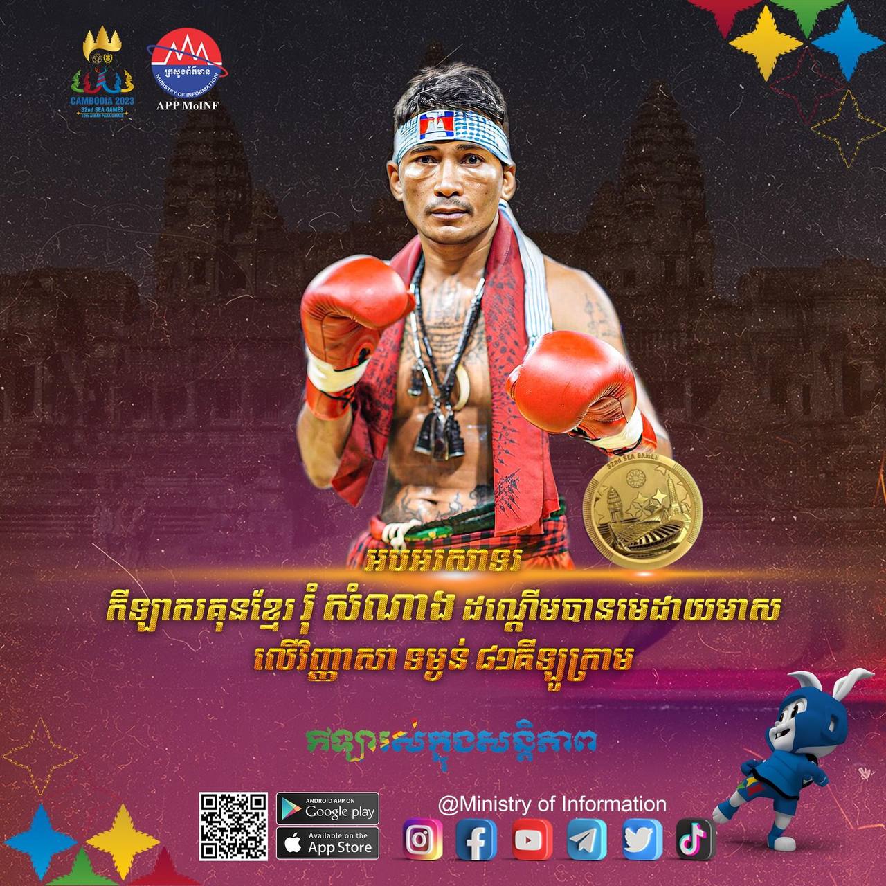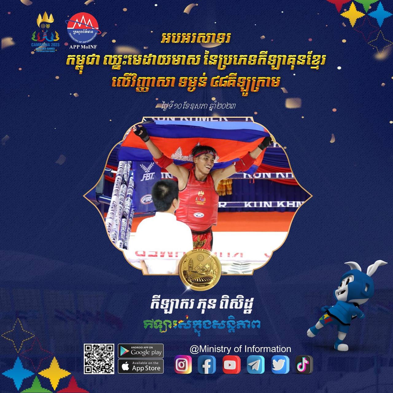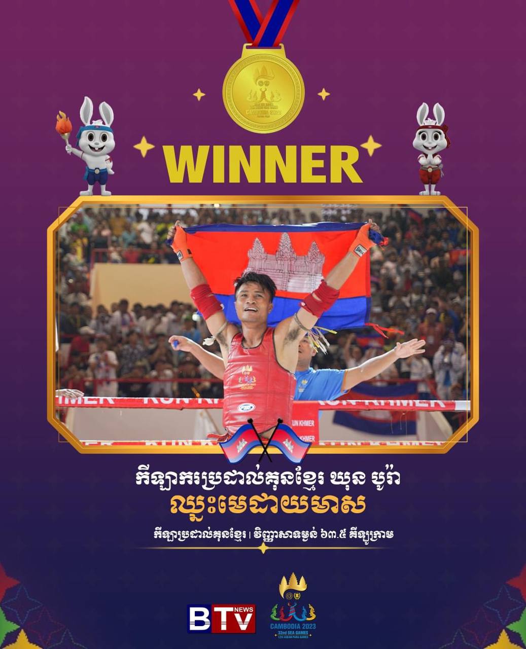 ក្រោយពីបានបិទបញ្ចប់លើវិញ្ញាសារគុនខ្មែរនៅថ្ងៃទី១១ ខែឧសភា ឆ្នាំ២០២៣ កាលពីម្សិលមិញមក ឃើញអត្ដពលិកកម្ពុជាគឺទទួលបានមេដាយជាច្រើនលើសលុប លើអត្ដពលិកមកពីបណ្ដាប្រទេសផ្សេងៗ។ សូមចូលរួមអបអរសាទរ កីឡាករ កីឡាការិនី គុនខ្មែរ ដែលបាននាំមកនូវមោទនជាតិ ក្នុងមហាព្រឹត្ដិការណ៍រស៊ីហ្គេមលើកទី៣២ ឆ្នាំ២០២៣នេះ។ កីឡារស់ក្នុងសន្ដិភាព! កីឡានាំមកនូវមោទនភាពជាតិ!