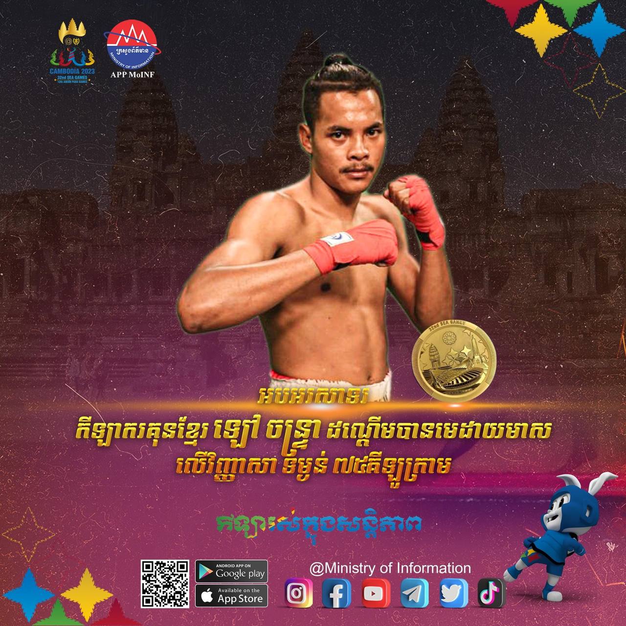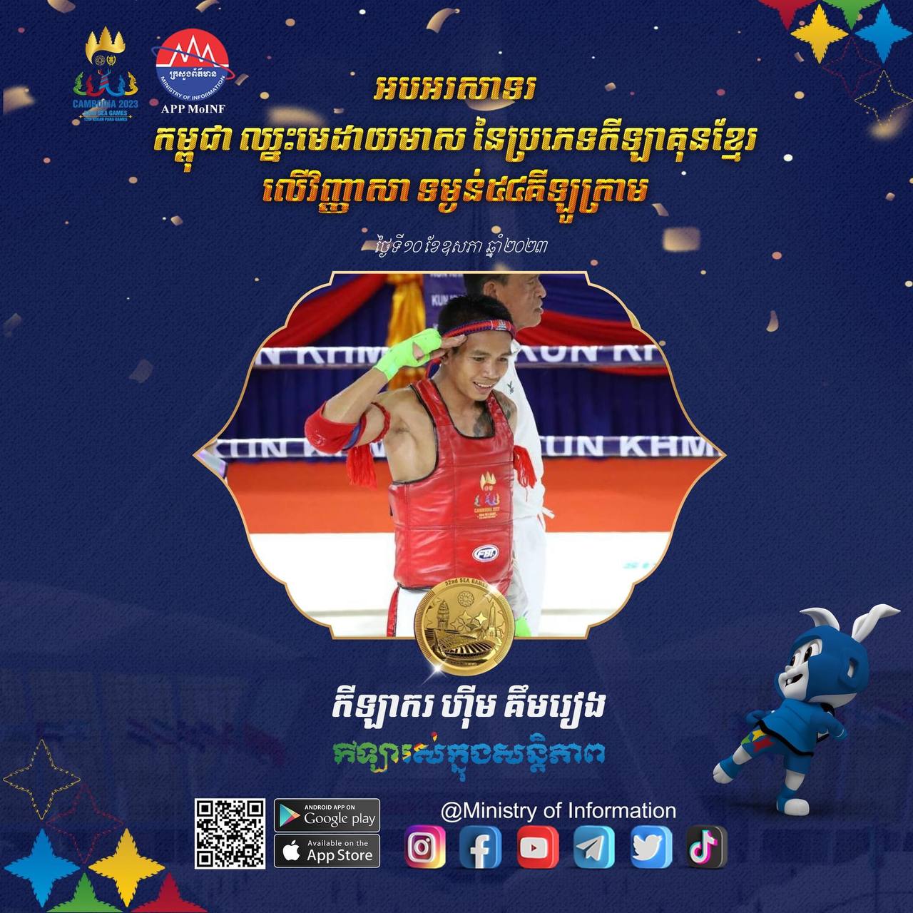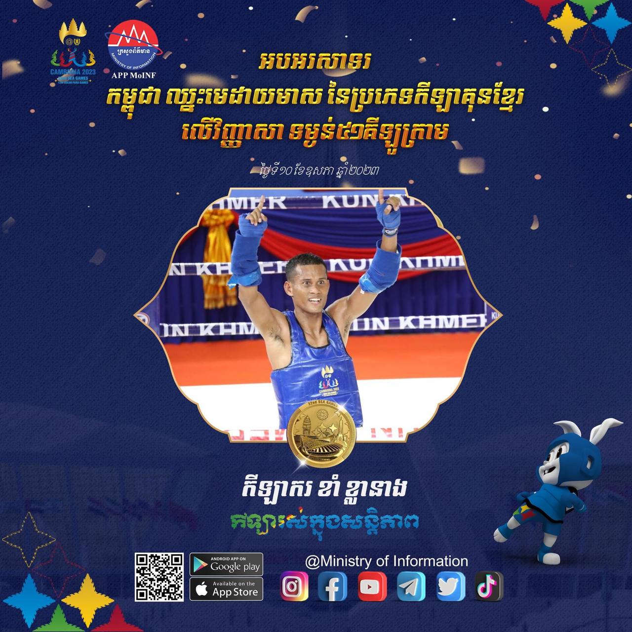 ក្រោយពីបានបិទបញ្ចប់លើវិញ្ញាសារគុនខ្មែរនៅថ្ងៃទី១១ ខែឧសភា ឆ្នាំ២០២៣ កាលពីម្សិលមិញមក ឃើញអត្ដពលិកកម្ពុជាគឺទទួលបានមេដាយជាច្រើនលើសលុប លើអត្ដពលិកមកពីបណ្ដាប្រទេសផ្សេងៗ។ សូមចូលរួមអបអរសាទរ កីឡាករ កីឡាការិនី គុនខ្មែរ ដែលបាននាំមកនូវមោទនជាតិ ក្នុងមហាព្រឹត្ដិការណ៍រស៊ីហ្គេមលើកទី៣២ ឆ្នាំ២០២៣នេះ។ កីឡារស់ក្នុងសន្ដិភាព! កីឡានាំមកនូវមោទនភាពជាតិ!